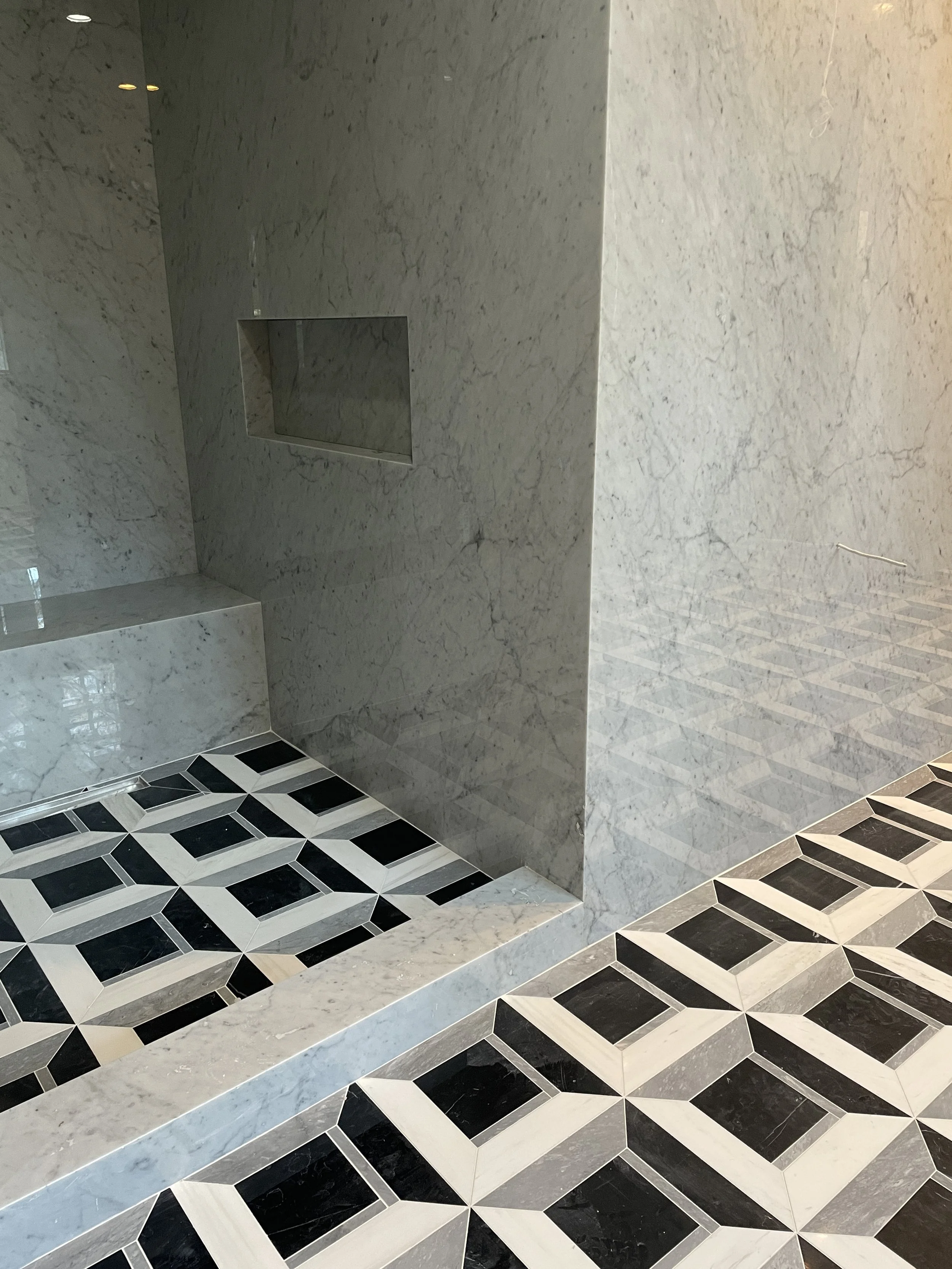 The design features polished chrome, classic black-and-white contrasts, bold marble, refined millwork, and sophisticated lighting creating an atmosphere of timeless elegance and high style.